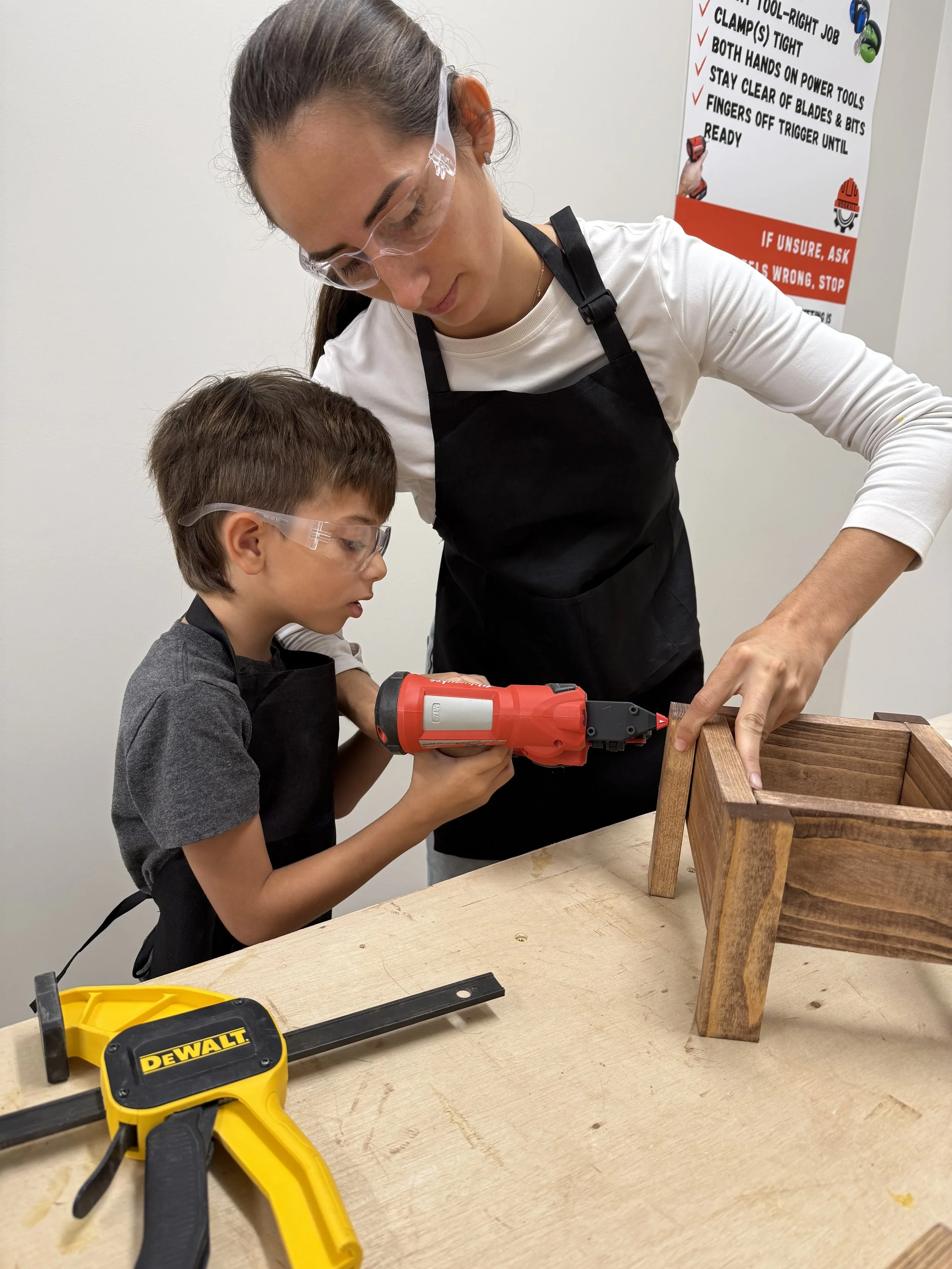❋ Mother's Day build: April 25You and your kids build a real wood planter box from scratch. You measure, drill, and assemble — we coach you through every step. Ends with a finished project and a handwritten card moment while the paint dries.